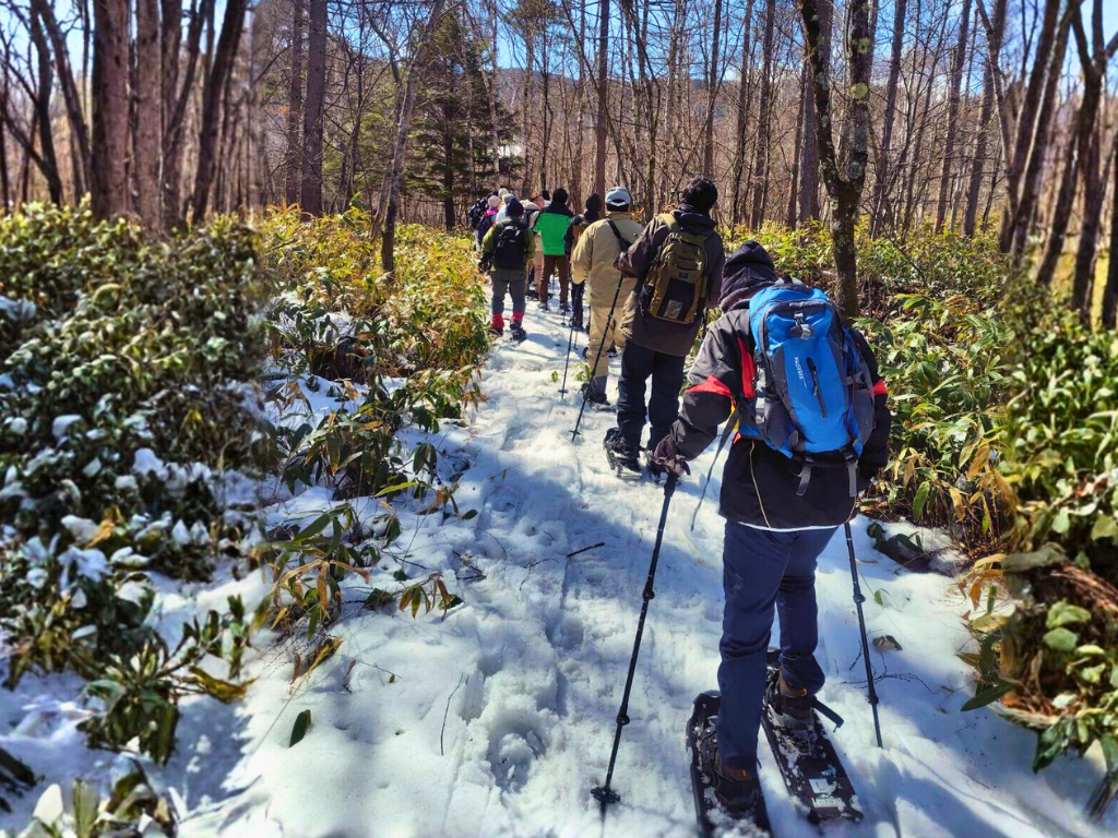 今年は連日の暖かさの影響もあり、この時期としては珍しいほど雪が少ない状況での開催となりましたが、冬の自然を感じながらゆったりとスノーシュー体験を行いました。参加者の皆さんは、雪の残る森の中を歩きながら会話を楽しみ、普段とは少し違う自然の中での交流を満喫している様子でした。